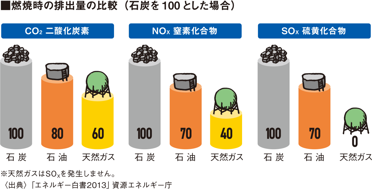 都市ガス(天然ガス)はメタンを主成分とする無色透明のガスです。大気汚染の原因となる窒素酸化物や硫黄酸化物もほとんど発生しません。また、他の化石燃料に比べ燃焼時のCO₂の発生が少ないことから、低炭素社会の早期実現に向け、有効なエネルギー源として期待されています。さらに人体に有害な一酸化炭素を含んでいないことから、人と環境にやさしいエネルギーと言えます。