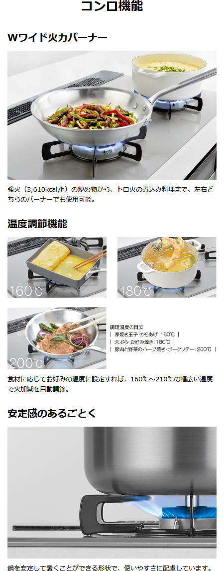 Wワイド火力や便利機能を搭載したビルトインコンロ。